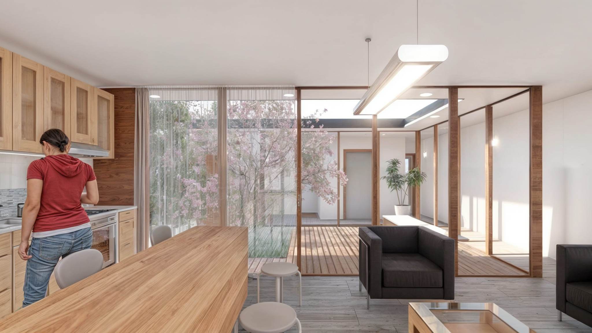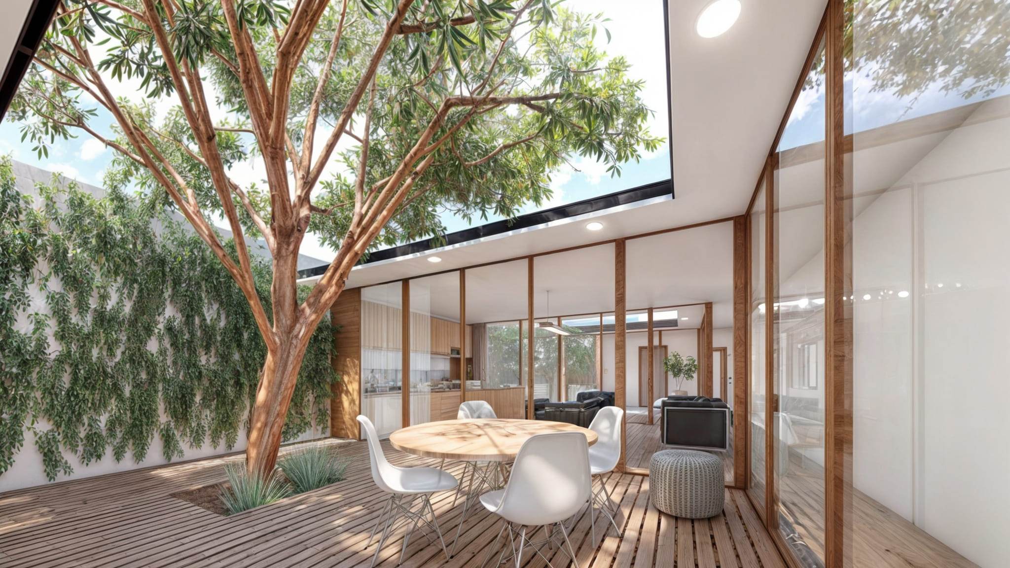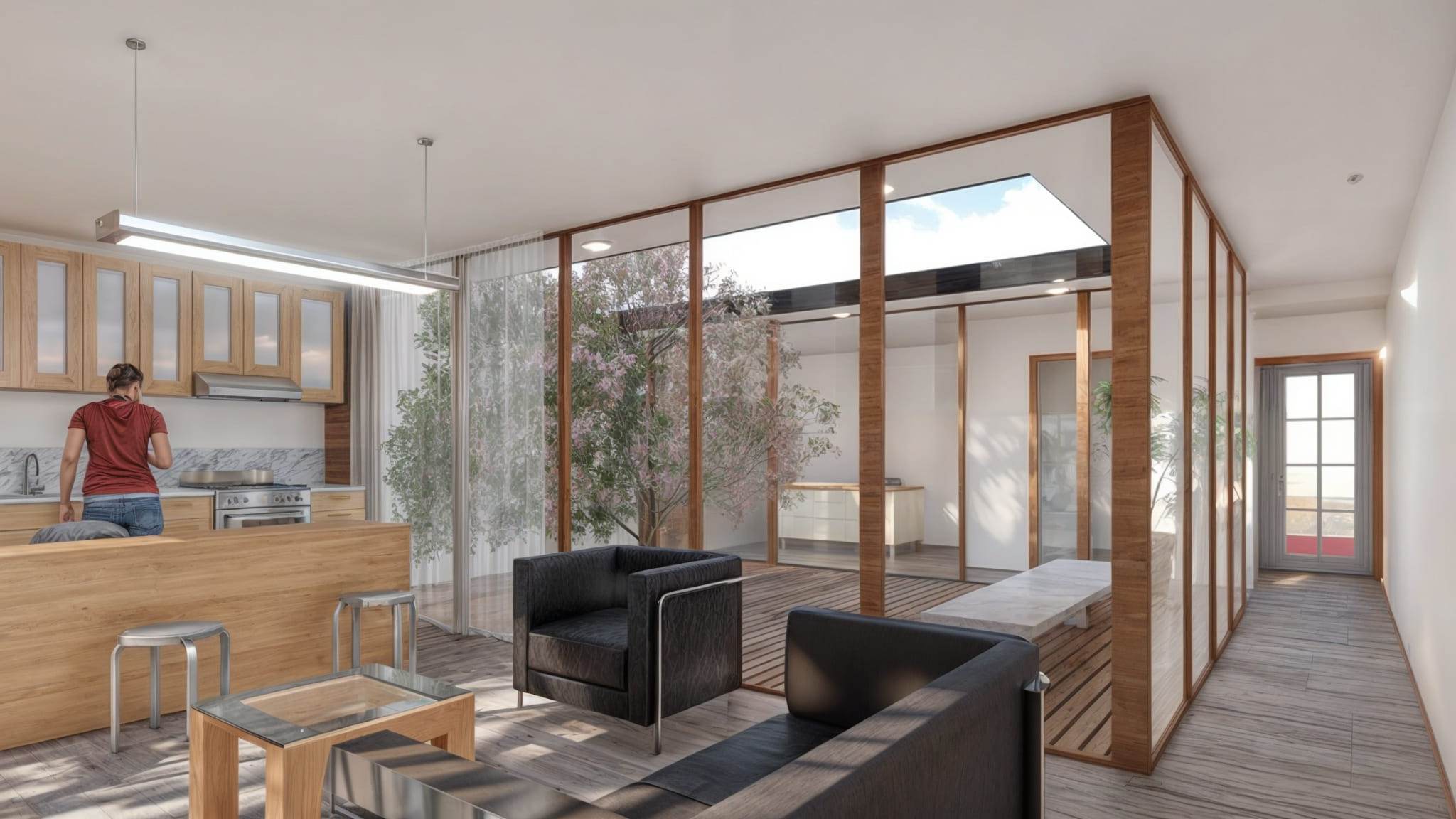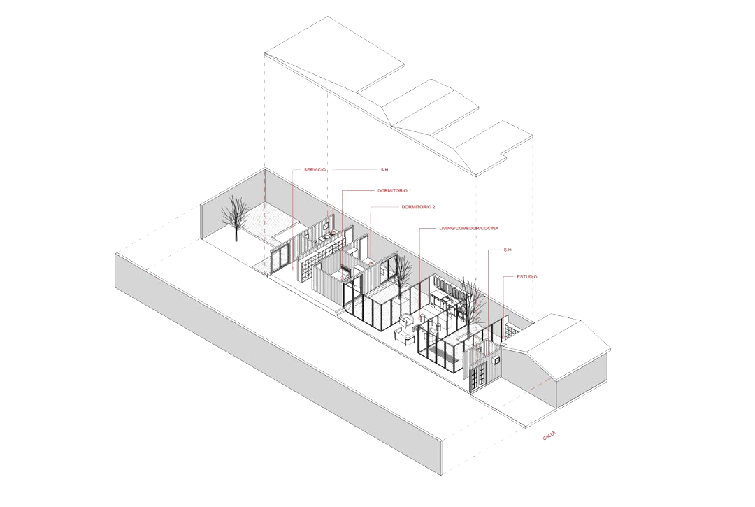Del análisis del barrio se toman para el proyecto la existencia de un ritmo dado por la relación entre llenos y vacíos, construcciones y patios. De este modo la estrategia de organización de la vivienda se plantea a partir de una serie de patios que le dan un ritmo asociado a las relaciones publicas y privadas de los espacios, en una gradiente de lo mas publico a lo mas privado. Estos patios, ademas, corresponden a espacios de «expansión» de modo que los programas asociados en los volúmenes adyacentes pueden expandirse hacia estos en una condición observada en el modo de habitar actual de la familia.