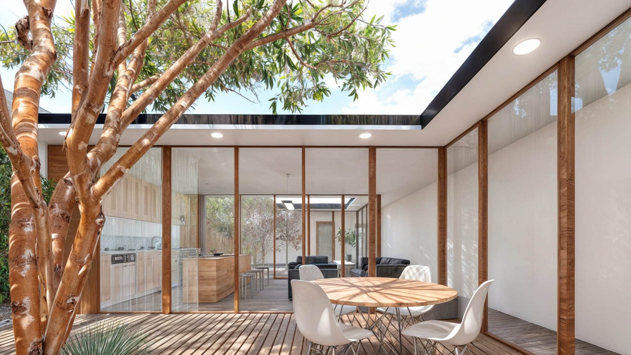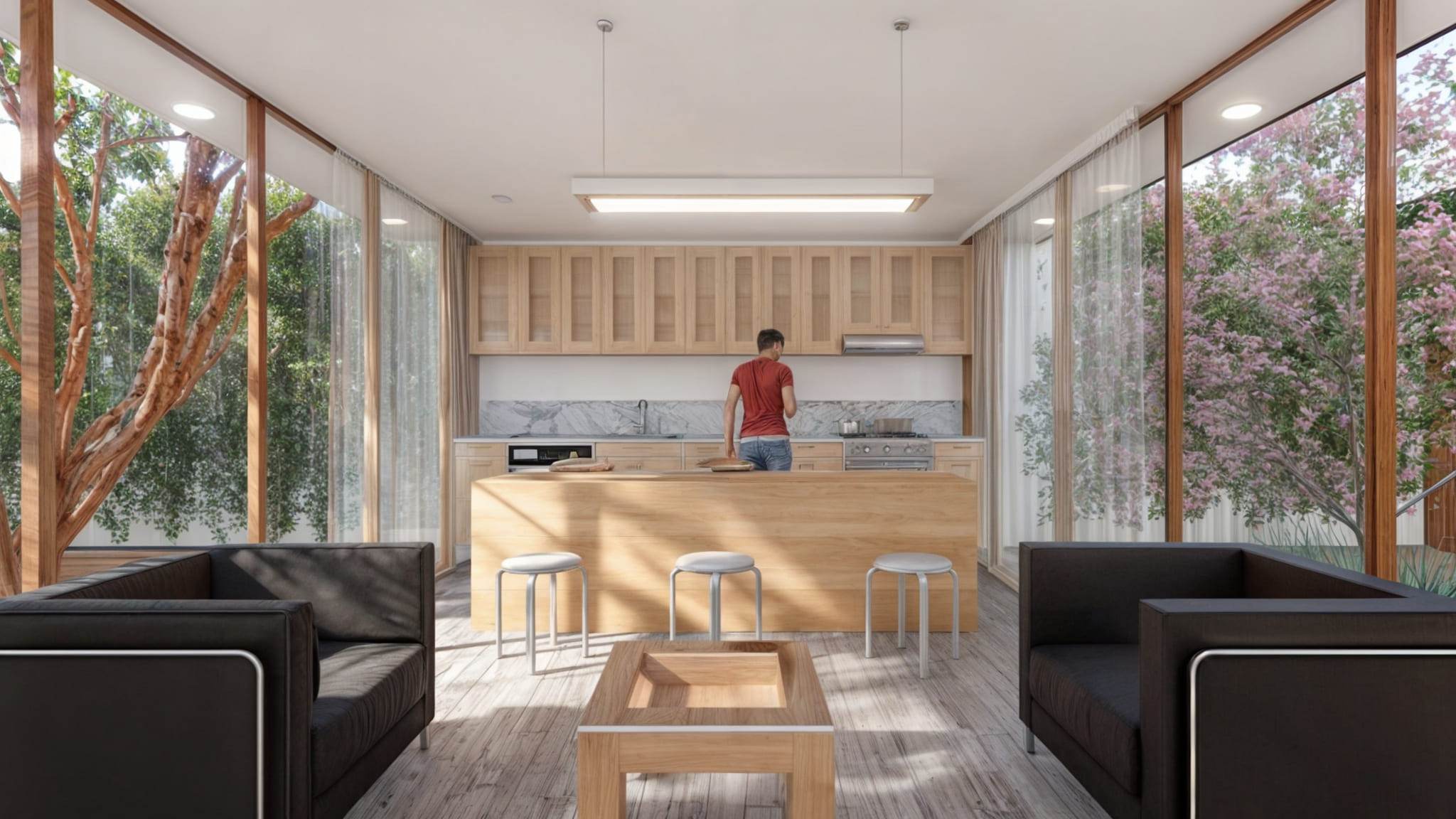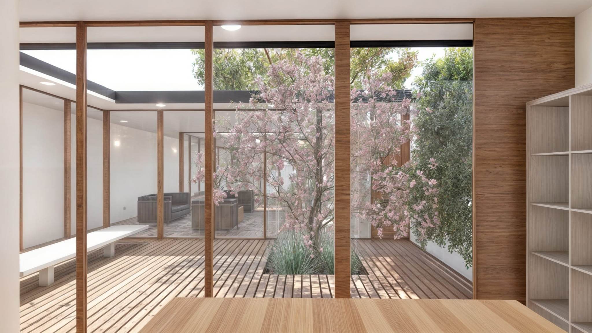 Del análisis del barrio se toman para el proyecto la existencia de un ritmo dado por la relación entre llenos y vacíos, construcciones y patios. De este modo la estrategia de organización de la vivienda se plantea a partir de una serie de patios que le dan un ritmo asociado a las relaciones publicas y privadas de los espacios, en una gradiente de lo mas publico a lo mas privado. Estos patios, ademas, corresponden a espacios de «expansión» de modo que los programas asociados en los volúmenes adyacentes pueden expandirse hacia estos en una condición observada en el modo de habitar actual de la familia.